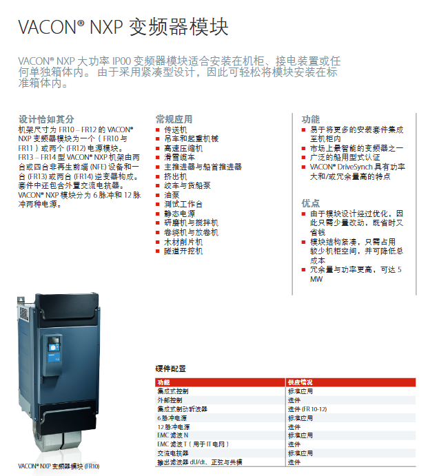 This document is from Danfoss regarding VACON ® NXP and VACON ® The technical selection guide for NXC series AC frequency converters was released in January 2019, focusing on the motor variable speed control requirements in industrial scenarios. The product covers a power range of 0.55 kW to 2 MW, adapts to multiple voltage levels, provides diverse installation forms and rich functional options, meets international safety and EMC standards, and can meet the basic and demanding application needs of multiple industries such as mining, lifting machinery, oil and gas. At the same time, it is equipped with full lifecycle technical support and services.