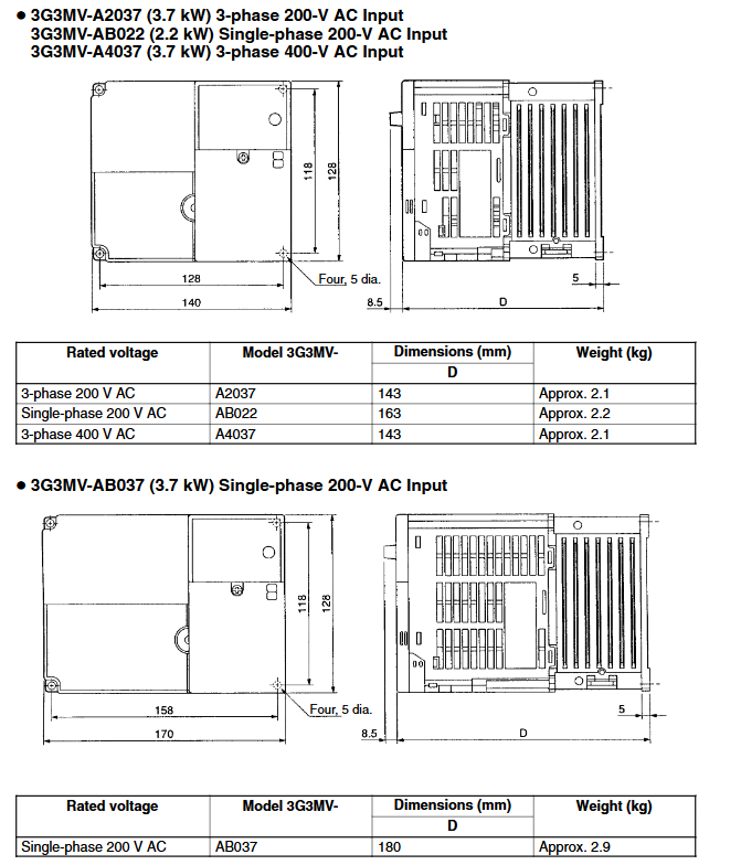 200V single/three-phase 0.1-7.5kW panel installation IP20, IP00 0.6-4.8kg after removing cover