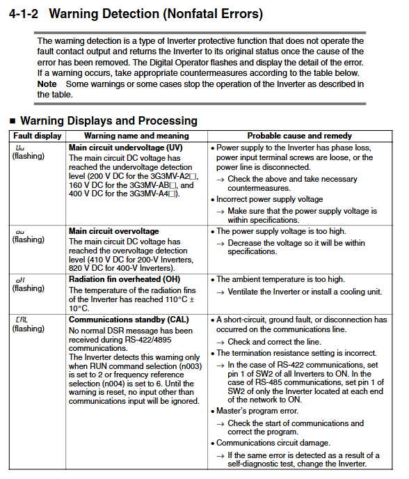 |Warning Code | Warning Name | Probable Reason | Troubleshooting Measures|