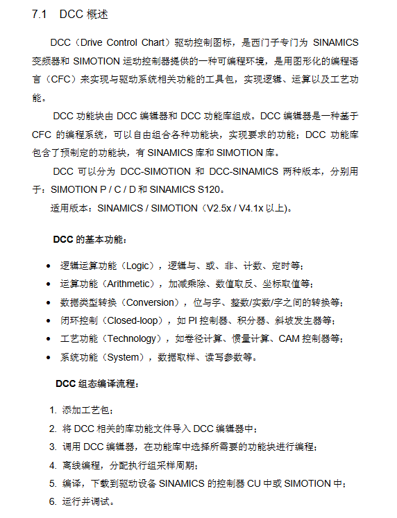 DCC (Drive Control Chart) is a graphical CFC programming tool developed by Siemens for SINAMICS/SMOTION. It supports FW V2.5x/SCOUT V4.1x and above, and implements functions such as logic, computation, and closed-loop control.