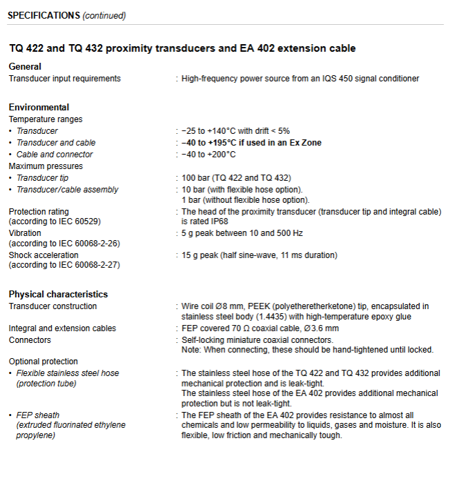 Meggitt TQ 422/TQ 432/EA 402/IQS 450 Proximity Measurement System Product Manual (Version 7), consisting of TQ 422/TQ 432 non-contact sensors, EA 402 extension cables, and IQS 450 signal conditioners. Based on the eddy current principle, it realizes non-contact measurement of relative displacement of moving mechanical components, supports 1m/5m/10m system total length configuration, measurement range of 2mm or 4mm, output voltage (-2.4~-18.4V) or current (-15.5~-20.5mA) signals, with IP68 protection level, 100bar withstand voltage, -25~+140 ℃ working temperature, and explosion-proof certification (Ex i/Ex nA), suitable for high-voltage scenarios such as submersible pumps and water turbines.