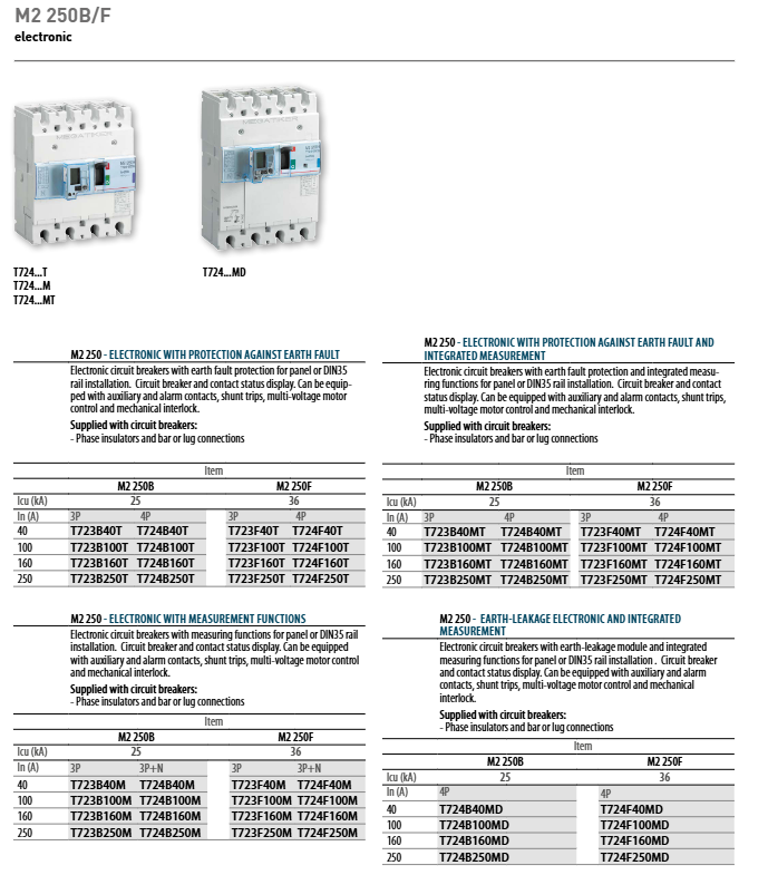 Electronic M2 250/M3 250 40-250A 25/36/50/70/100kA overload (adjustable Ir), short circuit (adjustable Isd), leakage, ground fault integrated energy measurement, LCD display
