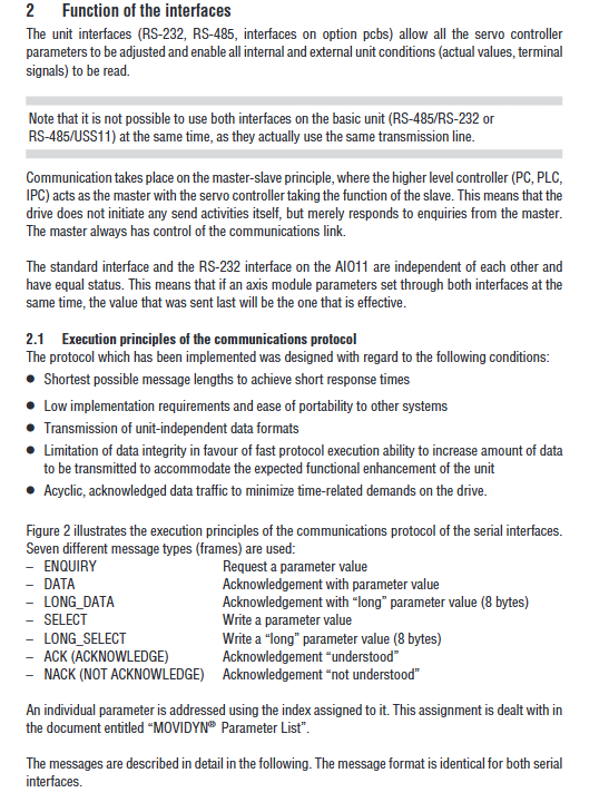 SEW EURODRIVE company MOVIDYN ® The Communication Interface Manual for Servo Controllers (January 1997 Edition) focuses on the communication protocols, technical parameters, connection methods, and application scenarios of the RS-232/RS-485 serial interfaces. It specifies that communication adopts a master-slave mode and defines seven types of MOVIDYN ® The message frame type and API/APA specific ASCII protocol are described in detail, including communication direction control, interface monitoring (500ms timeout), and communication configuration with PLC (such as Simatic S5 CP523 module). Multiple application examples of read and write parameters and variables are provided to provide a complete technical guide for data exchange between servo controllers and PC/PLC devices.