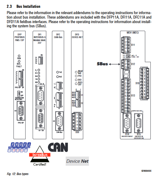 Corresponding bus tabs (PROFIBUS → DFP11A, INTERBUS → DFI11A, etc.) are required, and SBus does not require additional options