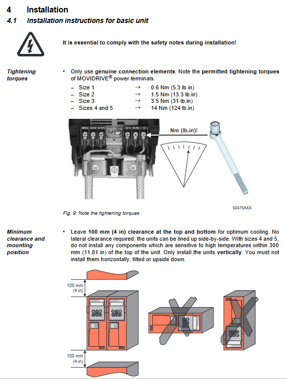 Installation spacing top/bottom ≥ 100mm; size 4/5, no high temperature sensitive components within 300mm of the top