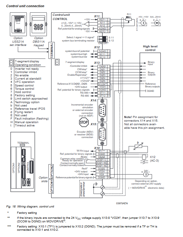 7-segment code display: There are a total of 16 states (such as “0”=not ready, “F”=fault flashing, “H”=manual mode)