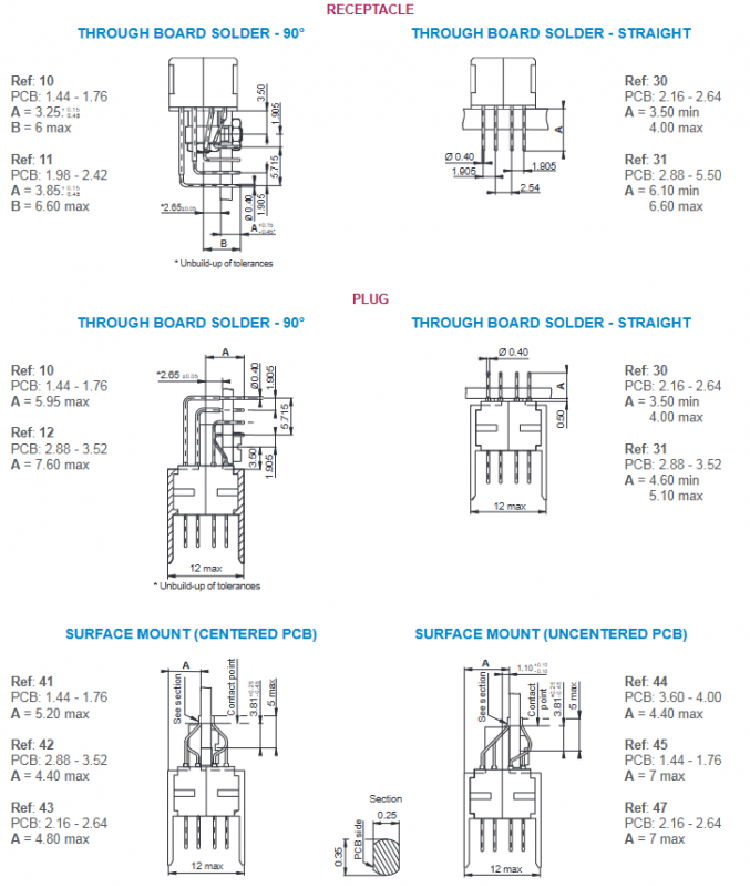 End connection method: including 90 ° through-hole soldering, straight through-hole soldering, surface mount (center/non center PCB), suitable for PCB thickness of 1.60-3.80mm