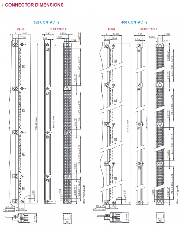 Connector size: The plugs/sockets with 52-400 contacts are labeled with detailed dimensions, and the fixing screws are M2 x 5, including theoretical dimension labeling