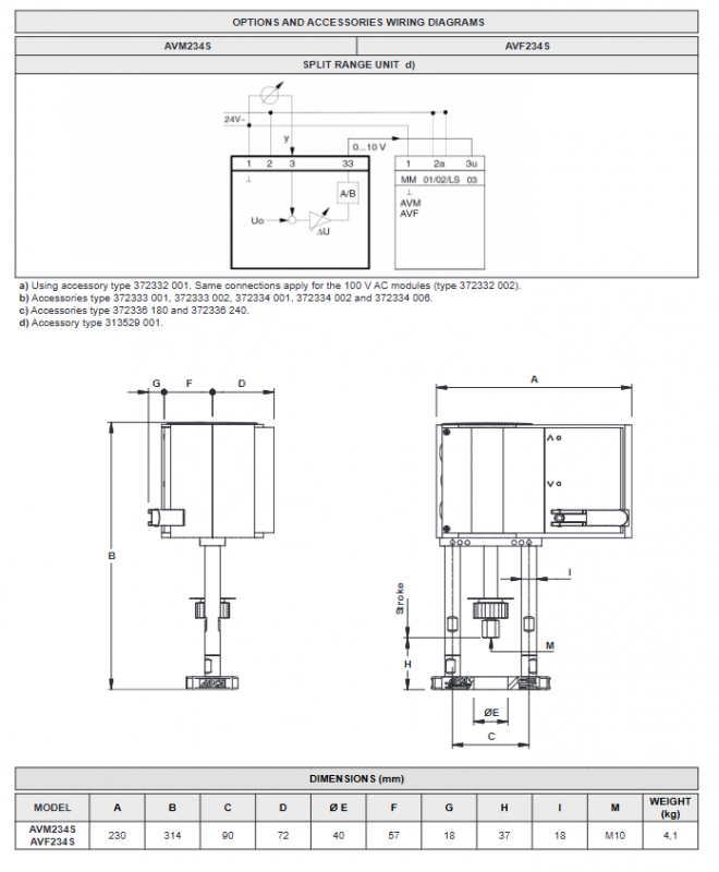 Dimensions (unit: mm): AVM234S/AVF234S universal, A=230, B=314, C=90, D=72, Ø E=40, F=57, G=18, H=37, I=18, thread M10;