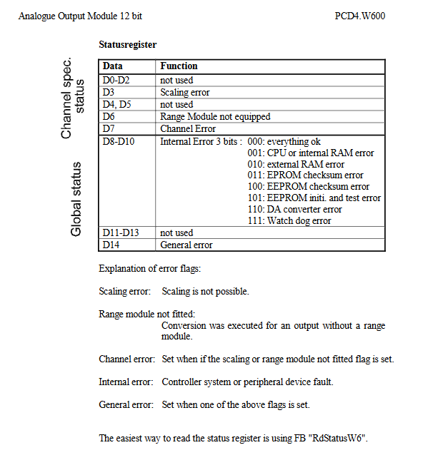 Fault detection: Output scaling errors, range module not installed, channel errors, internal faults (DA converter/EEPROM, etc.) through the status register.