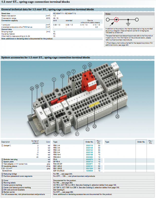 Bridge type accessories: including equal diameter bridge (optional for positions 2-50), variable diameter bridge (can connect terminals with different nominal cross-sections, such as ST10+ST2.5/4), and jumper bridge (can lay two potentials in parallel), with bridging current ranging from 24A-57A depending on terminal specifications;