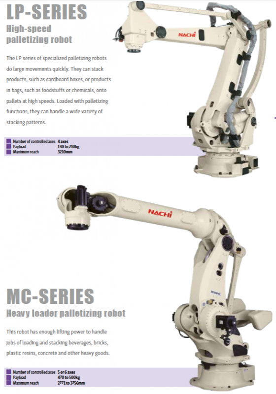 LP series: 4-axis, load 130-210kg, reach 3210mm, high-speed palletizing.