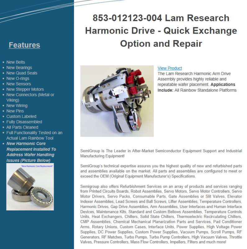 In addition to harmonic drive components, SemiGroup also provides refurbishment and repair services for the following categories: