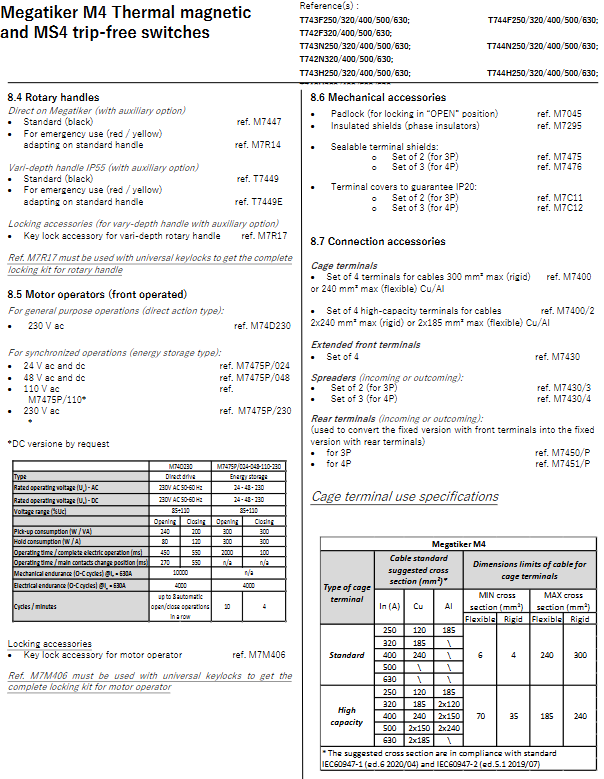 Technical specifications for Legrand Megatiker M4 thermal magnetic circuit breaker and MS4 isolating switch