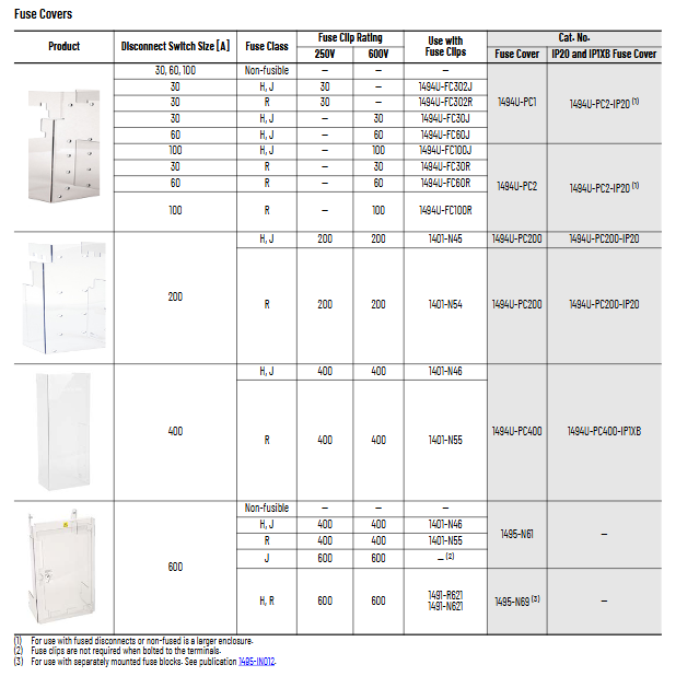 Power type (1491 power): 30~600A, 600V AC/250V DC, used for main circuit, motor, and high-power equipment protection, equipped with Class J/R/H fuses.