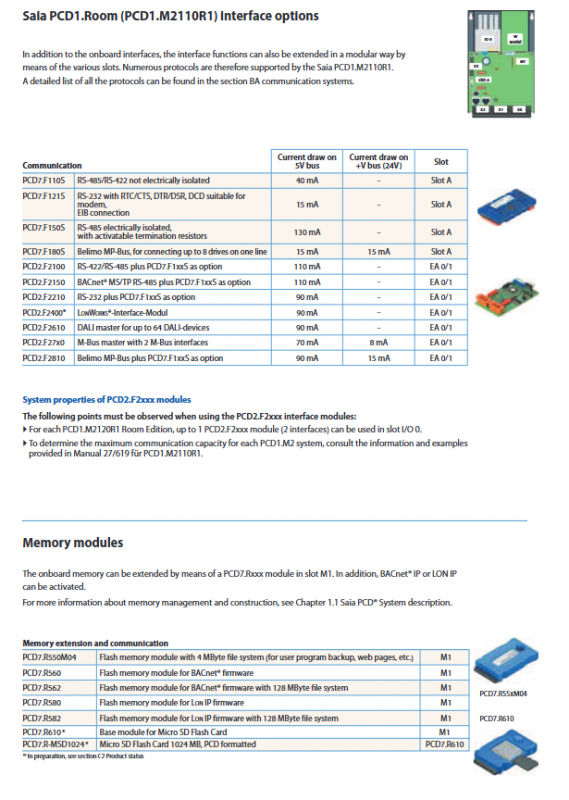 PCD7.R550M04 (4MB), R560/R562 (BACnet), R580/R582 (LON IP), SD card expansion