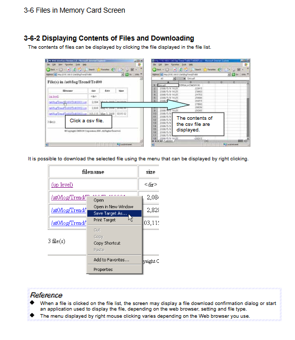 Memory card file management: browsing file lists, viewing content, downloading CSV/BMP files