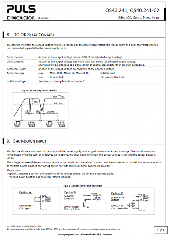 PULS QS40.241/QS40.241-C2 models 24V/40A/960W single-phase rail mounted switching power supply