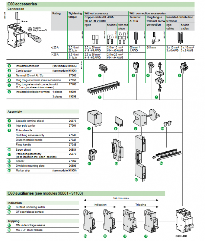 Schneider C60H-DC C-curve DC supplementary protector product sample, specially designed for DC distribution/feeder circuits, meets IEC/EN 60947-2, UL1077, GB 14048.2 standards, provides 1P/2P specifications, rated voltage covers 250V DC/500V DC, rated current is 0.5-63A, equipped with C-curve trip, polarity protection, short circuit current limiting, visual breaking indication, suitable for DC scenarios such as industrial automation, transportation, new energy, etc., clarifying core parameters such as breaking capacity, wiring specifications, temperature drop coefficient, auxiliary accessories, etc.