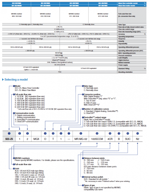 Model rule: SEC=Controller; SEF=flow meter; The number represents the range; 2=Digital/Analog, 4=DeviceNet, 7=EtherCAT; MGX=Multi Gas Multi Range Version.